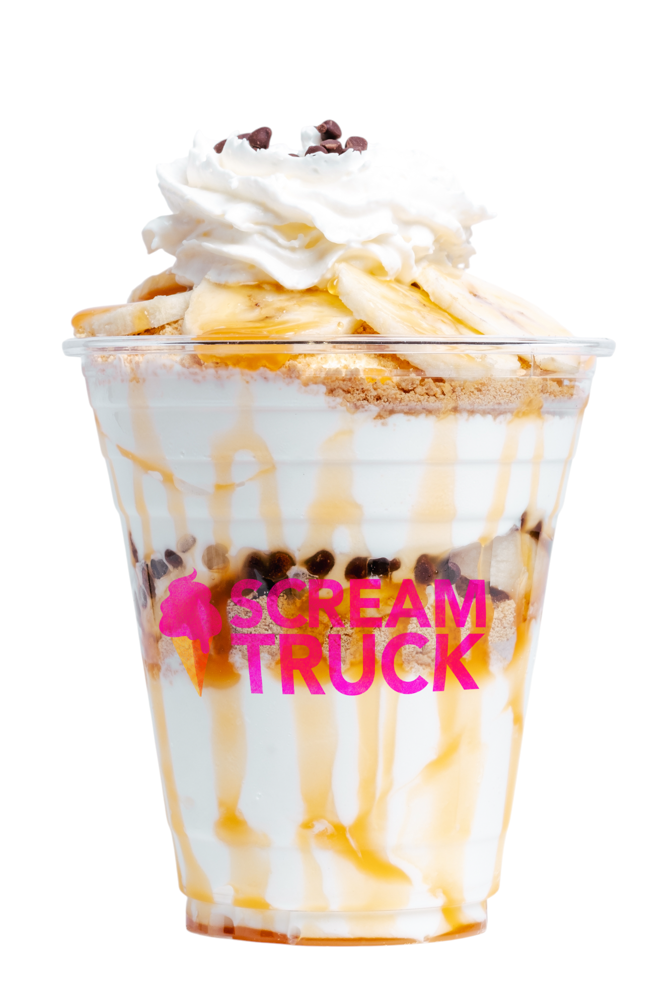 Back by popular demand! Vanilla Scream layered with fresh sliced bananas, graham cracker dust, and Ghirardelli dark chocolate chips, drizzled with Ghirardelli sea salt caramel and topped with whipped cream